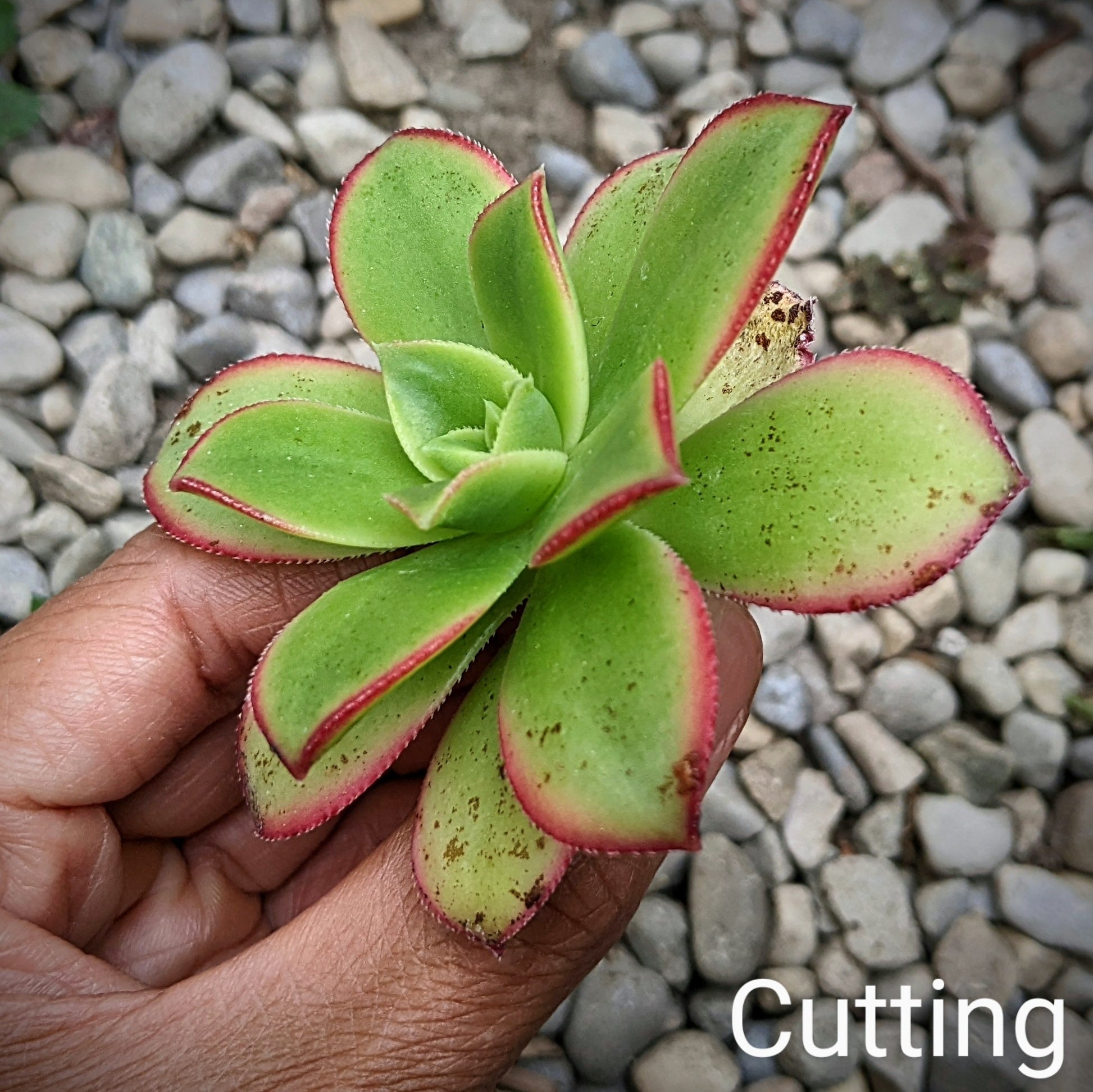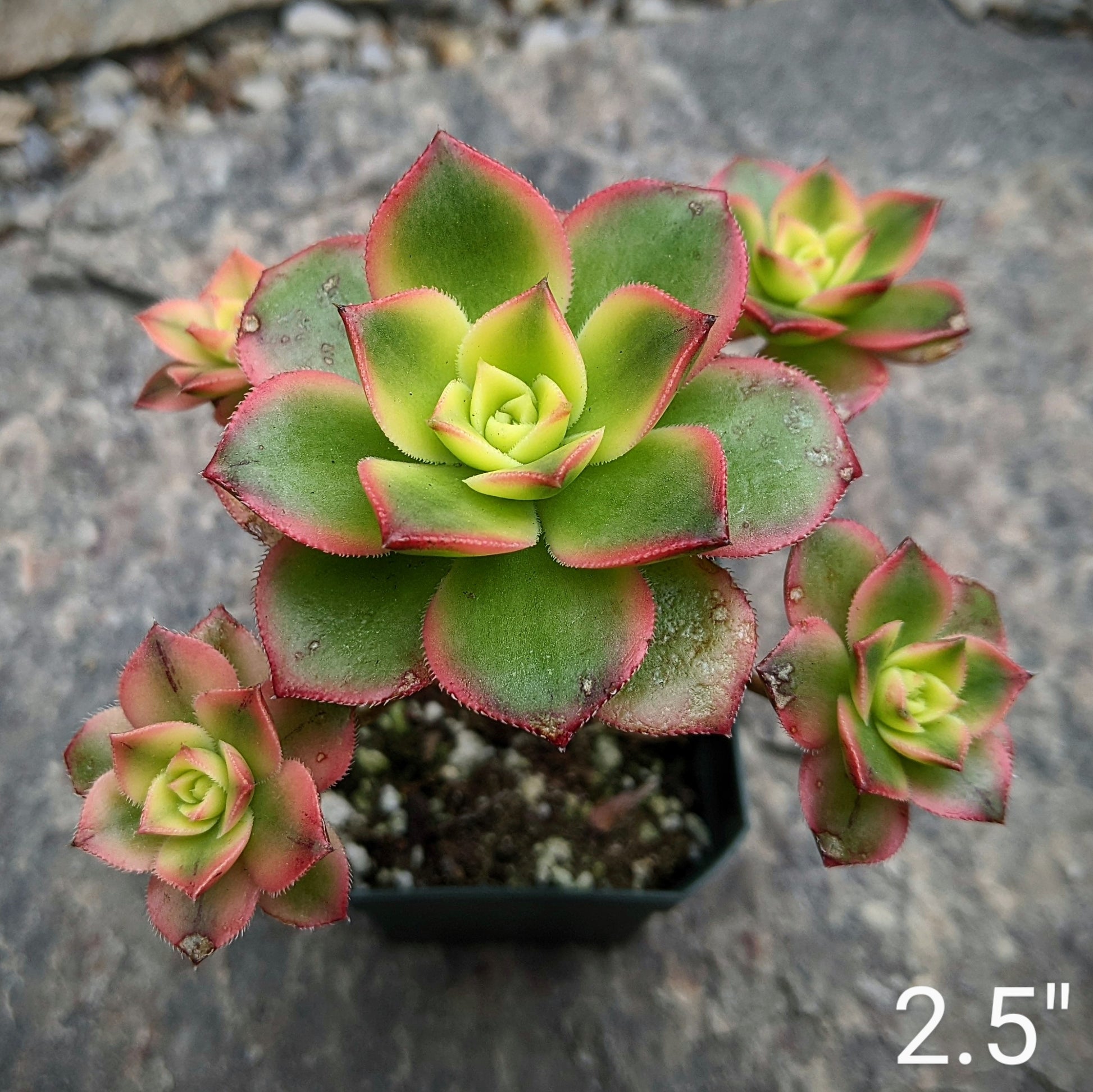 Aeonium 'Kiwi' is a stunning succulent known for its colourful, rosette-forming leaves. It is a hybrid of Aeonium haworthii and is native to Morocco. The leaves are green with creamy yellow margins and a hint of pink along the edges when exposed to bright light. Ideal for container gardening and well-draining soil, Aeonium 'Kiwi' thrives in bright, indirect light and requires minimal watering.