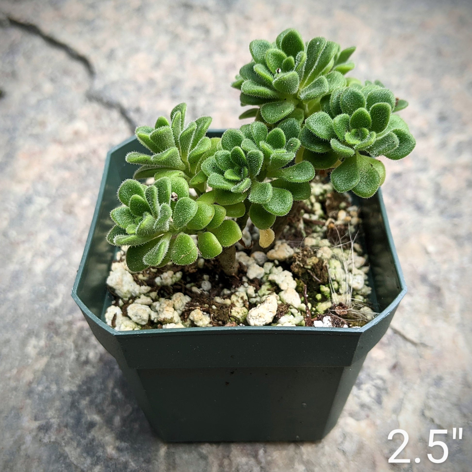 Aeonium Lindleyi var. Viscatum 'Irish Bouquet' is native to the Canary Islands. It is a dense compact small shrub and their leaves are densely glandular pubescent, which make them sticky.