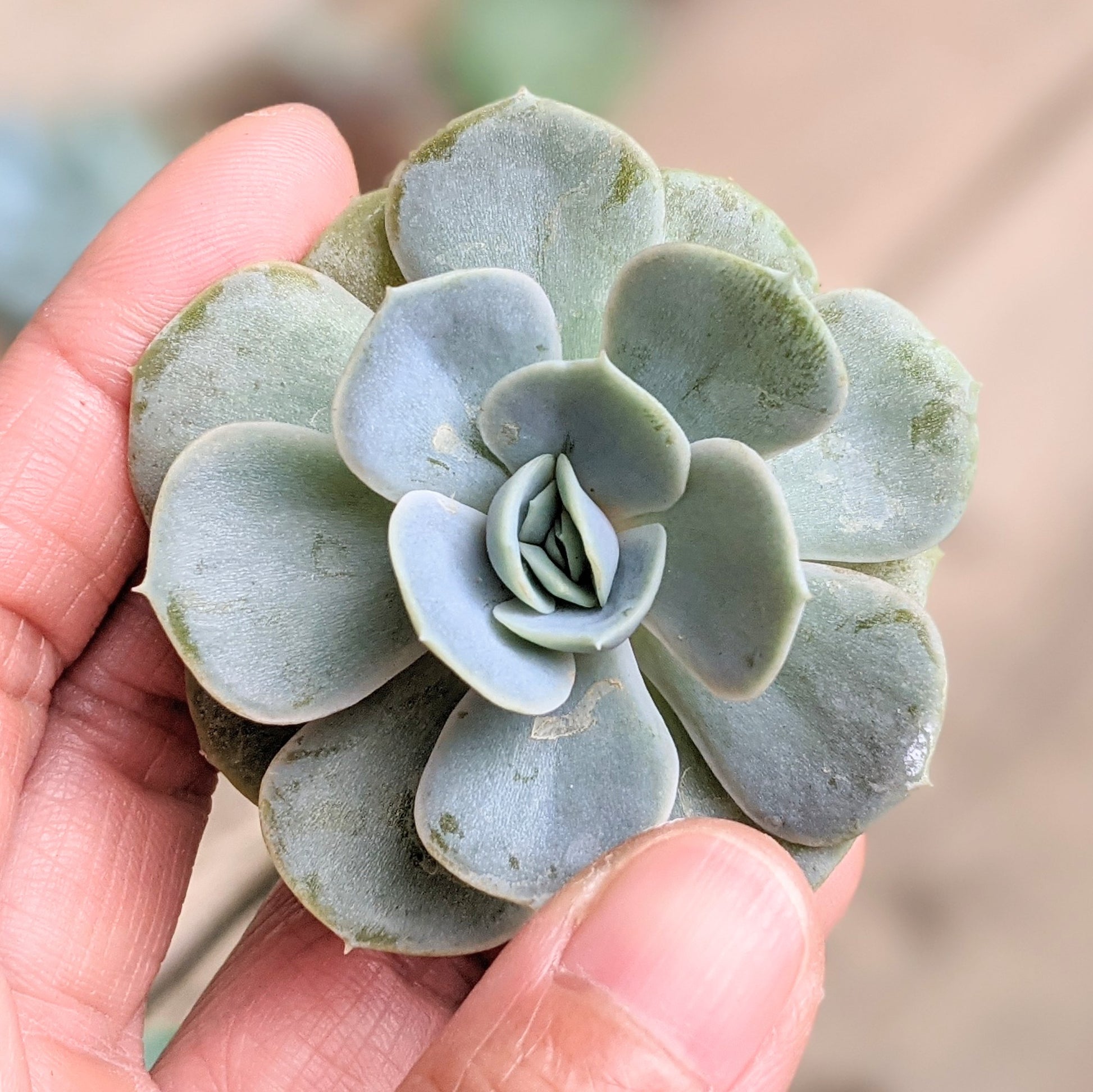 Echeveria 'Blue Surprise' is a captivating hybrid, believed to be a cross between Echeveria Agavoides and Echeveria Glauca. Known for its rosette of thick, fleshy leaves, this succulent showcases a stunning blue-grey colour with hints of lavender. When temperature-stressed, the leaves develop a beautiful pinkish hue. The leaves are slightly pointed with a smooth, waxy texture, arranged in a tight, symmetrical rosette. Growing up to 4-6 inches in diameter, this attractive plant thrives in bright, indirect light and well-draining soil, making it a perfect addition to any collection.