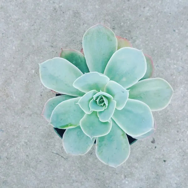 Echeveria 'Domingo' is a stunning hybrid crafted from E. Runyonii and E. cant. Its bold, powdery white to blue hue, with a hint of pink blushing at the leaf margins, creates a visually captivating appearance. It is capable of growing to a massive 10" in diameter, and is best kept in bright sunlight for maximum colour, and to maintain its compact rosette form.