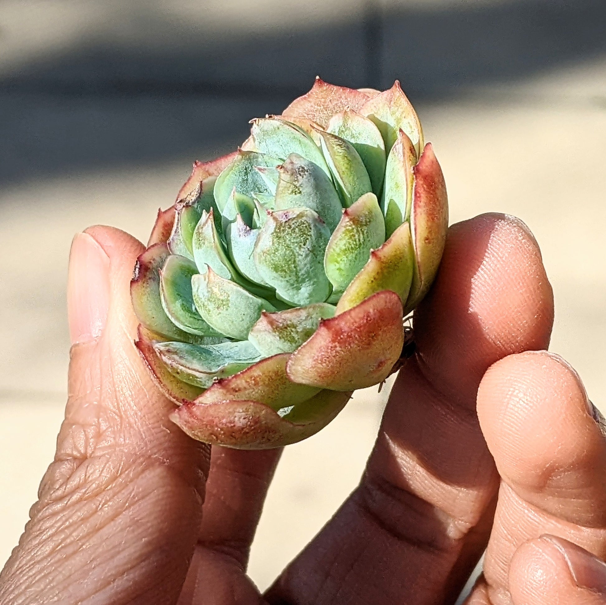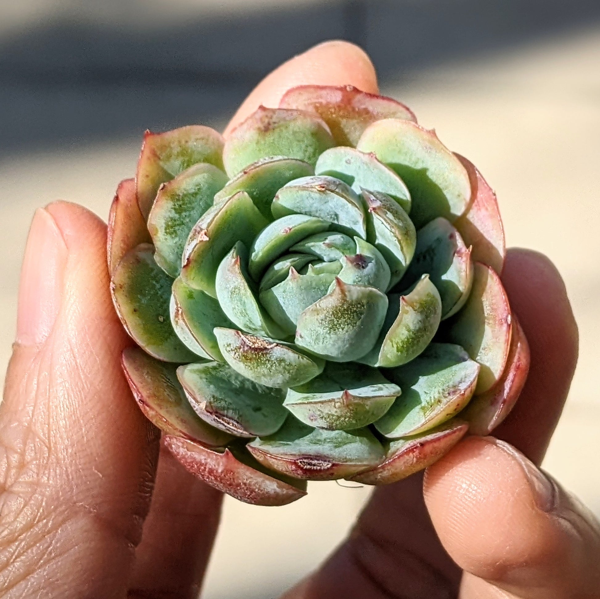 Native to Mexico, the Echeveria Elegans 'Raspberry Ice' is a hybrid from Mexican Snowball, often referred to as the "white ghost" or "hen and chicks" plants due to their clustered growth habit. Their leaves are covered in a powdery white coating, known as "farina," which offers protection from the sun. These plants develop stunning pink tones particularly on their older leaves, when placed in full sun or when stressed. To maintain their mesmerizing colours and compact rosette form, they require bright sunlight.