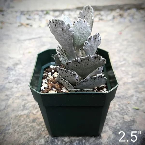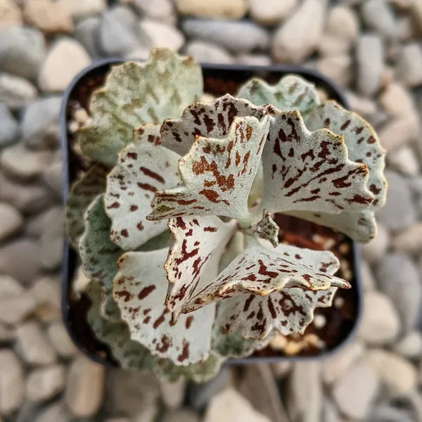 Kalanchoe Rhombopilosa, commonly known as Ruffle Leaves, is a distinctive succulent native to Madagascar. It features unique, grey-green leaves with wavy, ruffled edges and intricate brown markings. The leaves grow in a compact rosette formation, giving the plant an attractive, textured appearance. This succulent blooms with small, yellow flowers in the spring. Kalanchoe Rhombopilosa thrives in well-draining soil and requires minimal watering. It prefers bright, indirect light but can tolerate some direct sunlight.