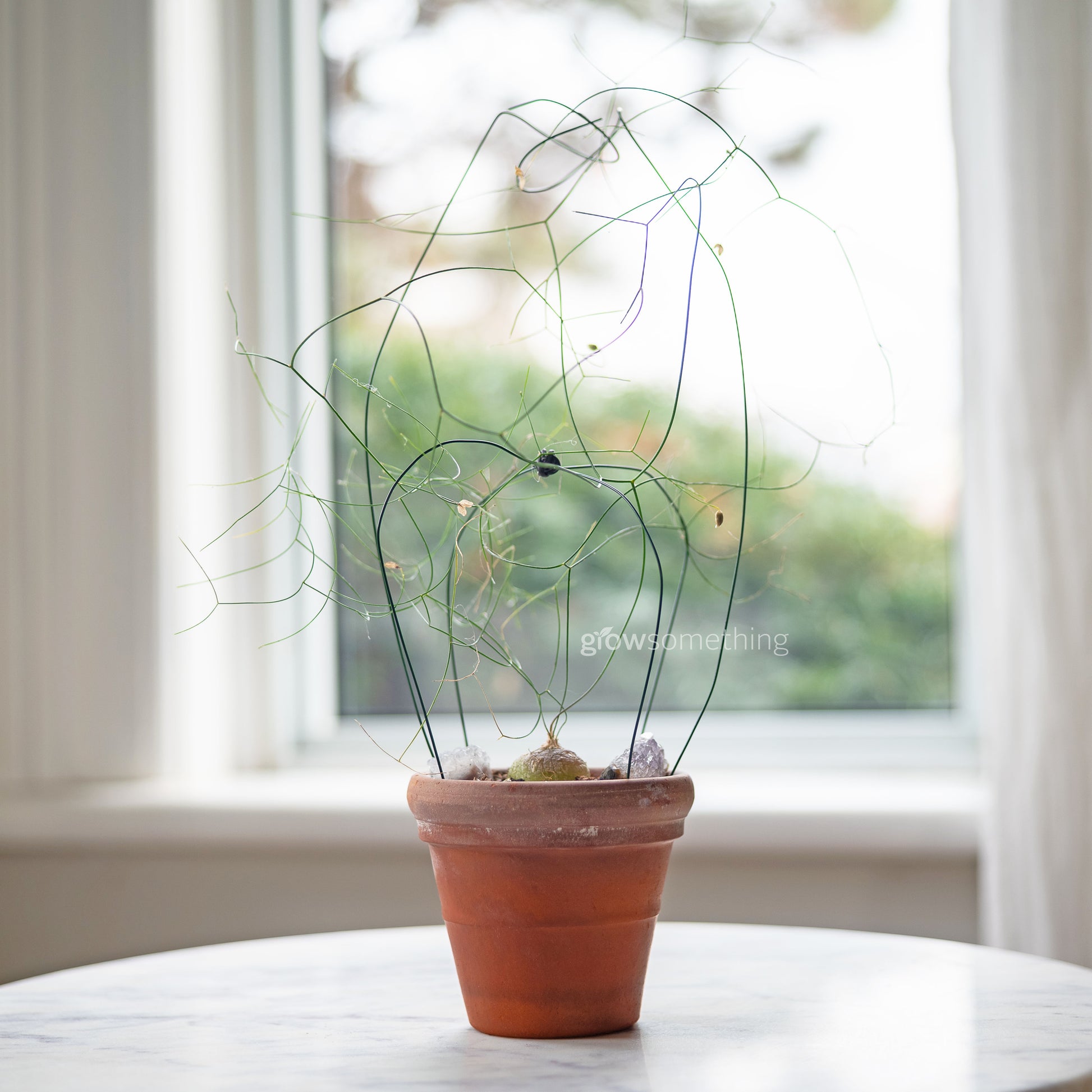 Schizobasis Intricata is a truly unique and unusual bulbous plant prized by collectors for its delicate, wiry stems and architectural growth habit. Often called the Climbing Onion, this plant produces a small exposed bulb from which thin, twisting green stems emerge, creating an airy, sculptural look unlike typical houseplants.