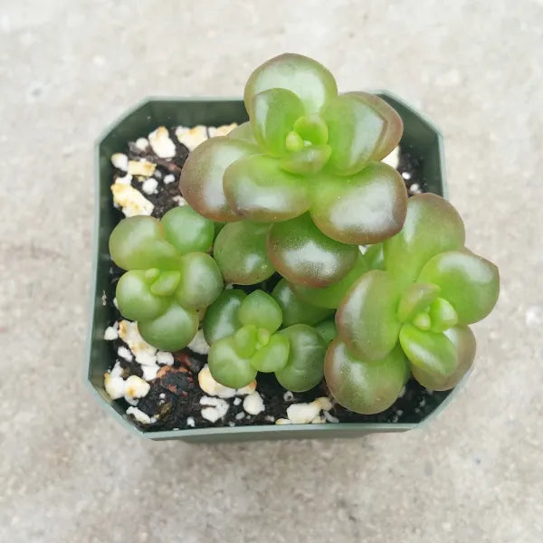 Sedum Lucidum, commonly known as the Shiny Stonecrop, is a small succulent native to Mexico. It is prized for its glossy, green leaves that form compact, rounded rosettes. The leaves are smooth and fleshy, often taking on reddish hues when exposed to bright sunlight or cooler temperatures. This plant can grow up to 18 inches (45 cm) tall. The stems are green when young, becoming grey or reddish as they age. Sedum Lucidum thrives in well-draining soil and requires minimal watering. It prefers full sun to partial shade and can produce clusters of small, star-shaped white or pale yellow flowers in the winter or early spring.