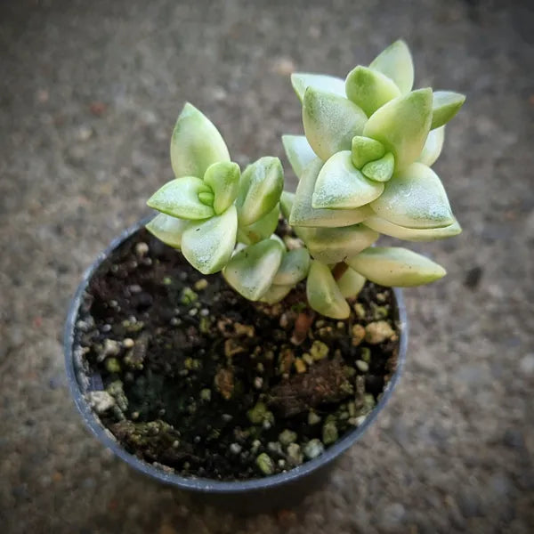 Crassula Rupestris ‘Kebab Bush’ Variegata is a striking, variegated succulent with stacked, triangular leaves in shades of cream, green, and soft pink. Native to South Africa, this compact, branching plant forms colourful clusters that blush under bright light. Its unique geometric shape and pastel tones make it a standout in any succulent collection. Best grown in bright, indirect sunlight with well-draining soil. Easy to care for and great for small spaces or dish gardens.