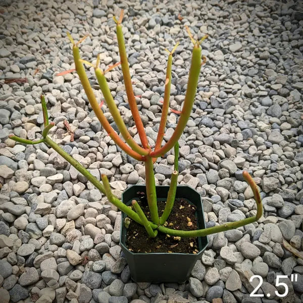 Add a fiery pop of colour to your plant collection with Euphorbia Tirucalli 'Firestick', also known as Pencil Cactus or Sticks on Fire. This eye-catching succulent transforms with the seasons, showcasing vibrant shades of orange, red, and yellow when exposed to bright sunlight. Its slender, pencil-like stems create a unique, sculptural form that makes it a standout piece in any home or garden.