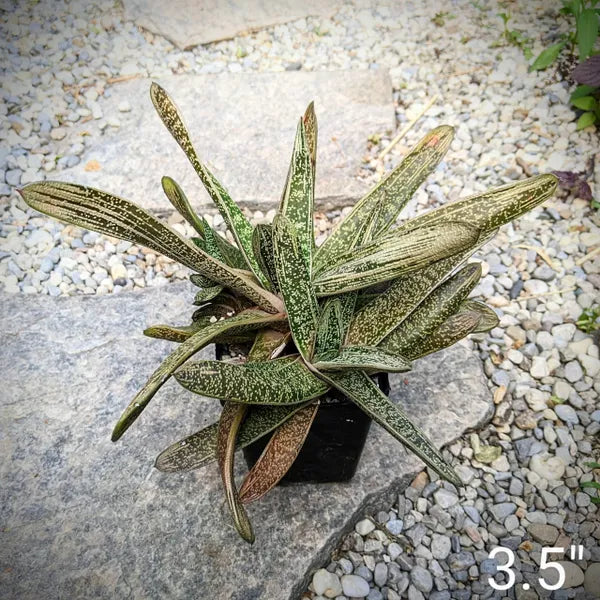Gasteria 'Little Warty', a hybrid created by Australian hybridizer David Cumming, is a diminutive succulent formed by a cross between Gasteria batesiana and Gasteria 'Old Man Silver'. This unique plant produces charming rosettes of thick, pointed green leaves adorned with delicate pale green stripes and raised edges, along with tiny white bumps. Its growth is slow, and as it matures, it produces offsets and forms a small cluster, reaching a height of 8 inches (20 cm) and a width of 6 inches (15 cm). Its unusual appearance, reminiscent of plastic, is due to its white and green coloration.