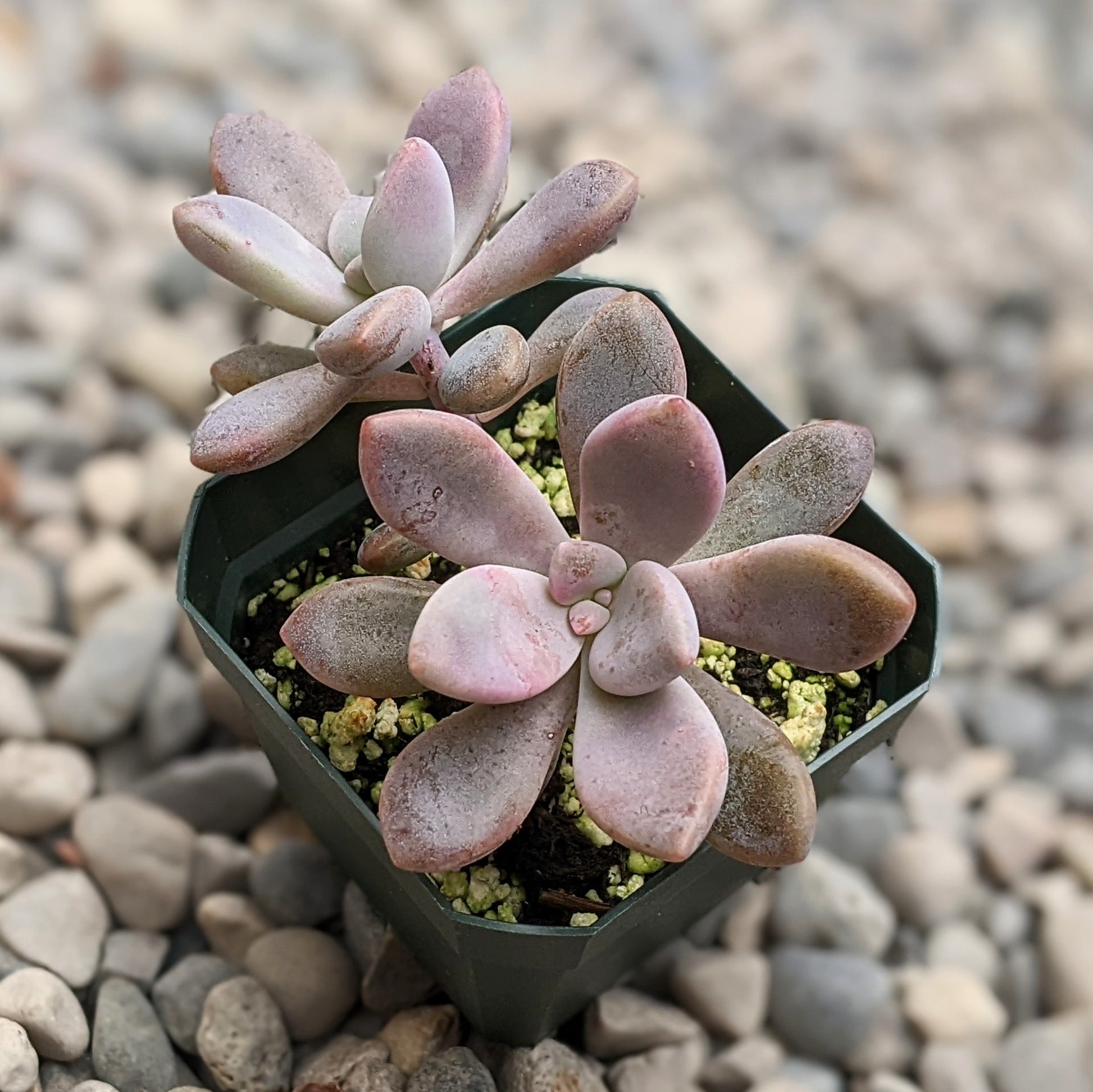 Graptopetalum 'Murasaki' is a stunning succulent known for its compact rosettes of fleshy, pastel-coloured leaves. The leaves display a beautiful blend of soft purple, pink, and green hues, which intensify in bright sunlight. This low-maintenance plant thrives in well-draining soil and enjoys full sun to partial shade.
