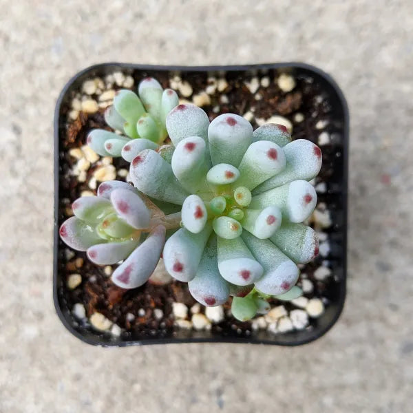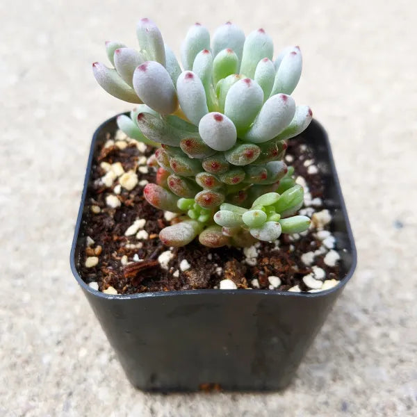 This small succulent is ideal for sunny gardens or balconies, as its leaves turn a striking shade of orange or pinkish-purple when exposed to warmer, sunnier conditions. Native to Mexico, Graptopetalum Pachyphyllum Bluebean forms low-growing clusters of mini rosettes, and easily thrives in full sun.