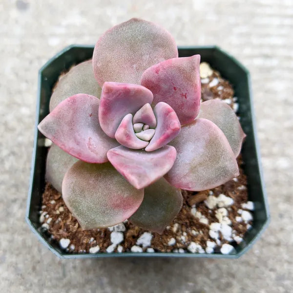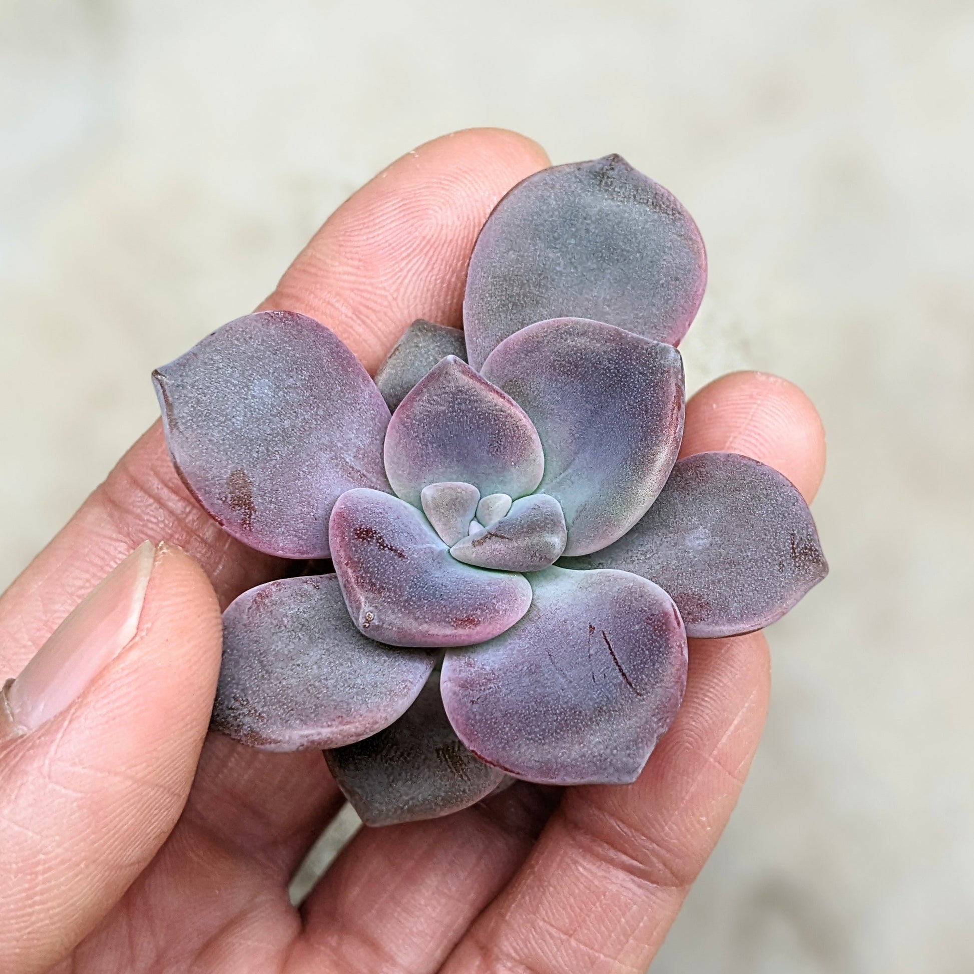 Graptoveria 'Purple Delight', also known as G. 'Snow White' or 'Crystal', is a beautiful succulent that thrives in full sun. Depending on the growing conditions, the color of the leaves can range from deep lilac to bubblegum pink to frosty white. It can grow to about 4.0" in diameter and has a powdery coating to protect it from the sun. The plant will then continue to grow tall on a bare stem.