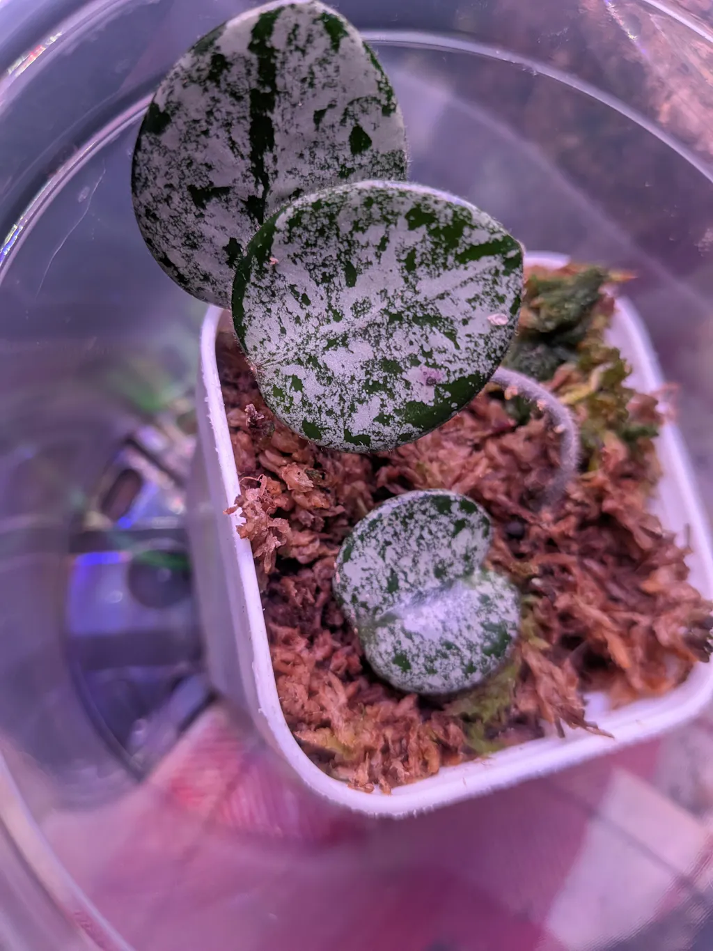 A charming hybrid between Hoya Carnosa and Hoya Serpens, Hoya Mathilde ‘Splash’ is a compact, trailing beauty known for its small, round green leaves speckled with silver splashes. Its vining habit makes it perfect for hanging baskets, shelves, or trailing from pots.