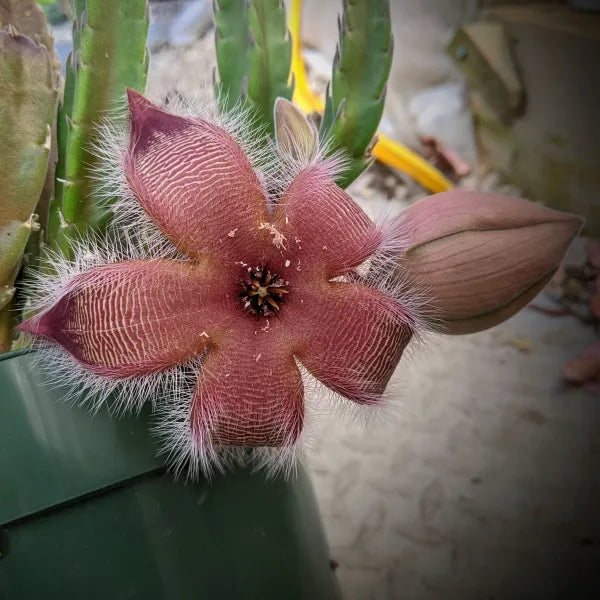 Native to South Africa, the Giant Toad Plant (Stapelia Grandiflora) is known by other aliases such as Giant Zulu, Star Fish Flower, Carrion Flower, and Great flowered Stapelia. These plants boast bold, star-fish shaped blooms that originate from younger shoots near the base. The flowers are intriguing due to their unpleasant scent resembling rotting meat, which attracts pollinating flies.