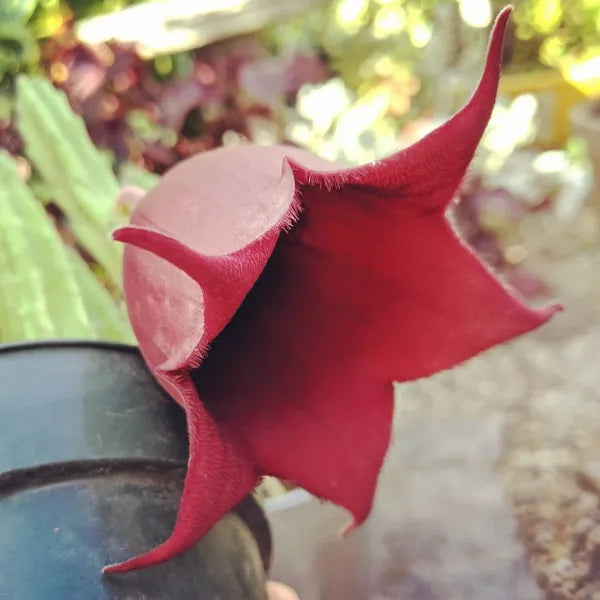 Stapelia Leendertziae, native to the rocky mountains of Swaziland, is a tufted creeping or procumbent plant that trails and hangs down over the pot. Its stems have small tubercles on the angles and exhibit purple mottling towards the tips. This plant can reach a length of 8 inches and a thickness of 1 inch.