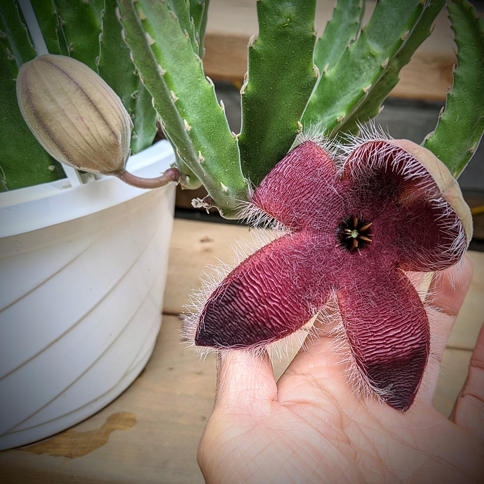 Stapelia Desmetiana bloom is very similar to stapelia grandiflora and equally smelly. Stapelia Desmetiana petals are thicker and darker in colour.